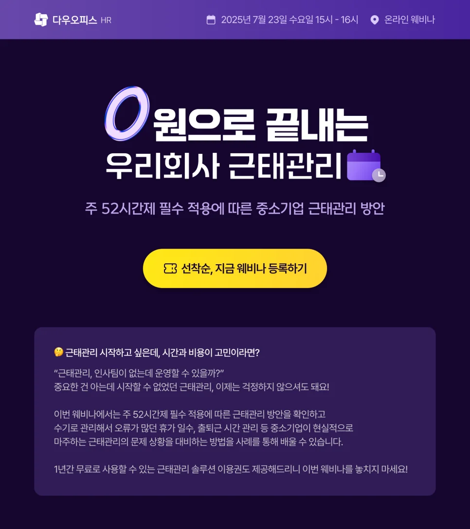이번 웨비나는 스마트 근태관리 솔루션 ‘다우오피스HR’의 런칭을 기념해 2025년 신규 신청 고객에게 1년 사용료 100% 무료 혜택도 함께 제공합니다.