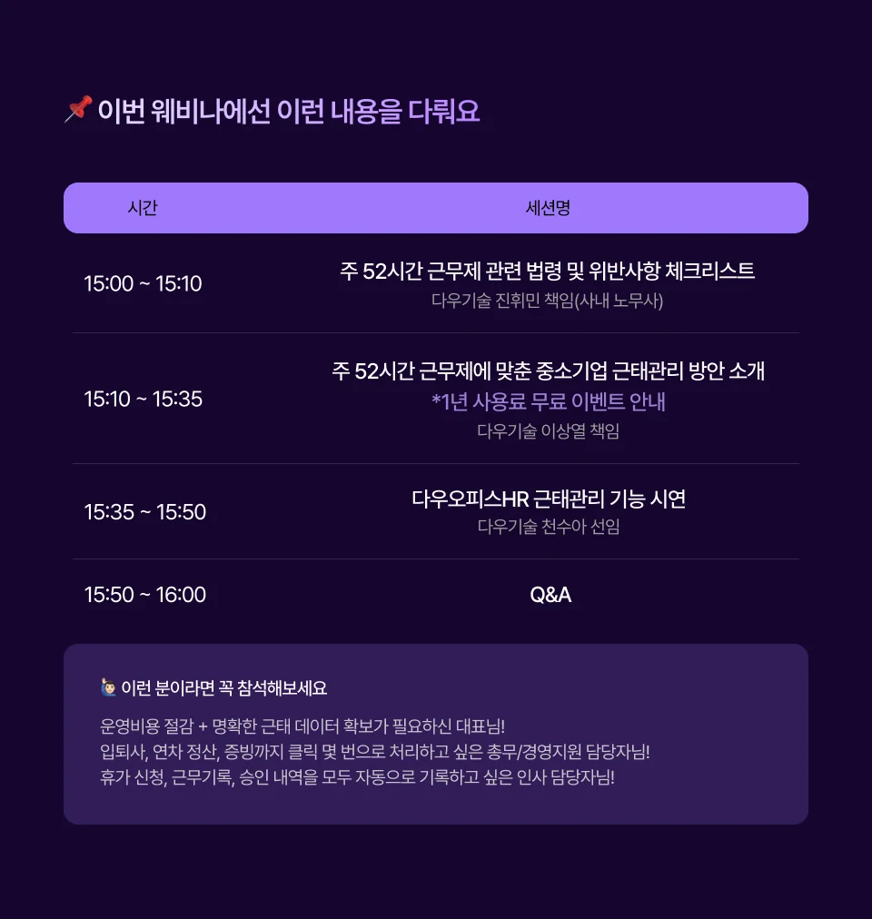 기업 인사담당자라면 꼭 알아야 할 주 52시간제 대응, 연차관리 자동화, 근태 시스템 고도화까지! 다우오피스HR 웨비나에서 실무 적용 노하우와 함께 만나보세요.