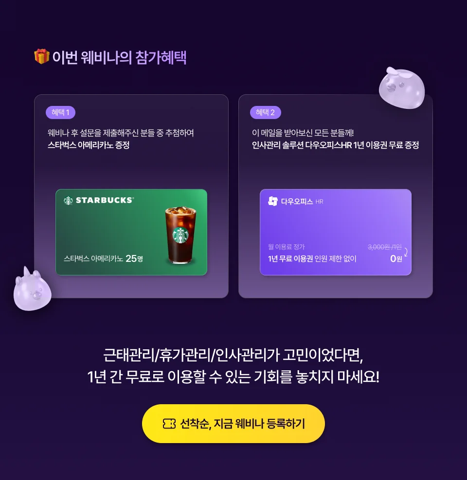 지금 웨비나에 참여하시고, 우리 회사의 인사관리 수준을 한 단계 높일 기회를 놓치지 마세요! 🎁