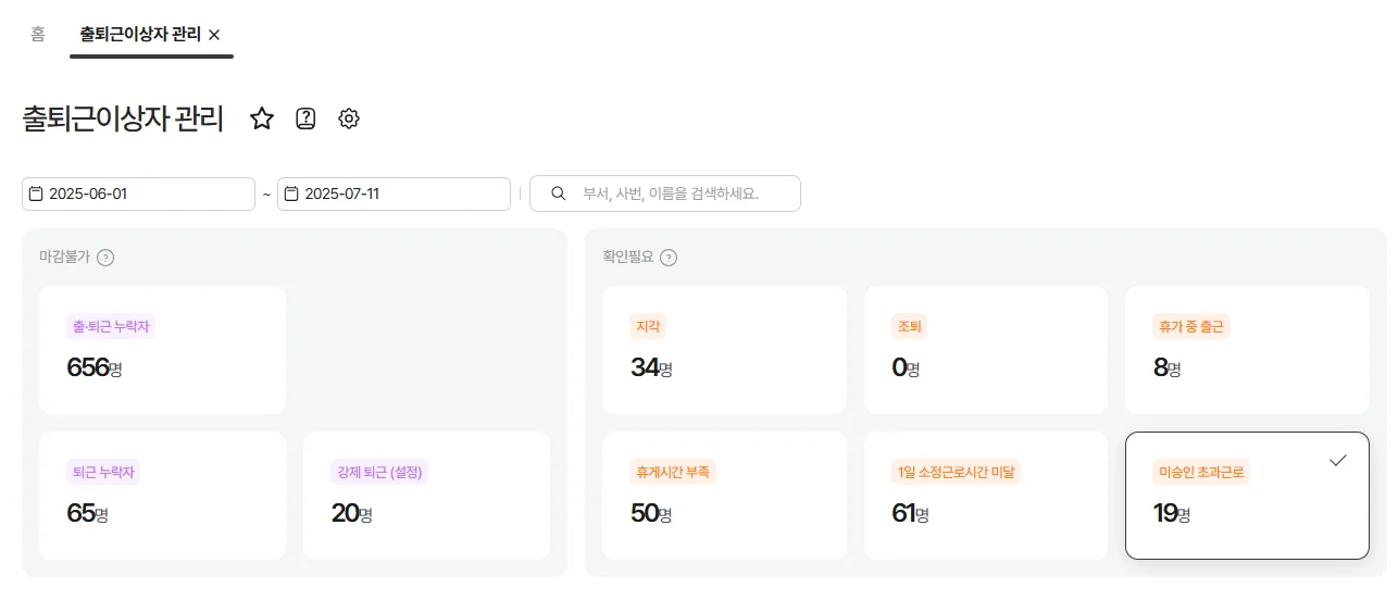 근태 이상 내역은 별도로 확인할 필요 없이 시스템이 자동으로 이상자를 분류합니다.