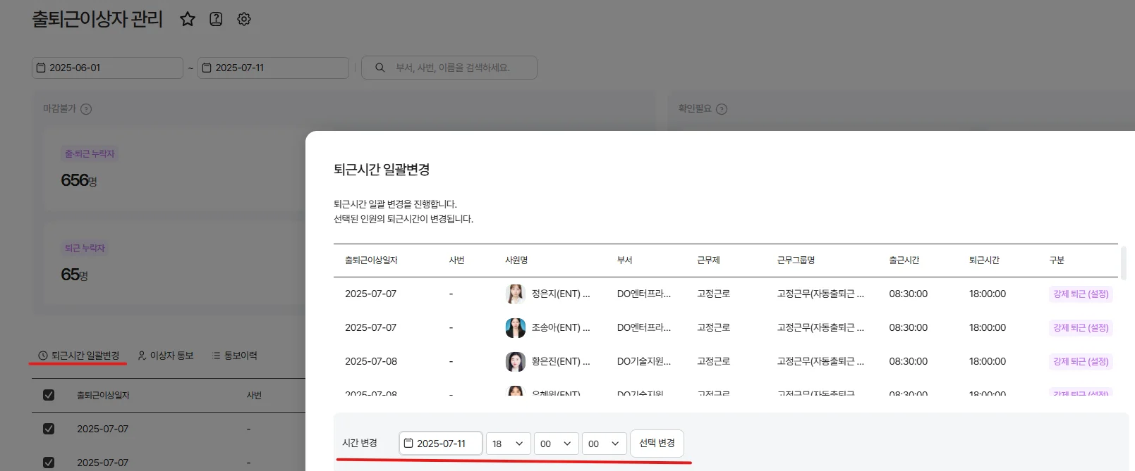 퇴근 후 추가 업무 시 자동 '퇴근취소' 및 근로시간 재산정